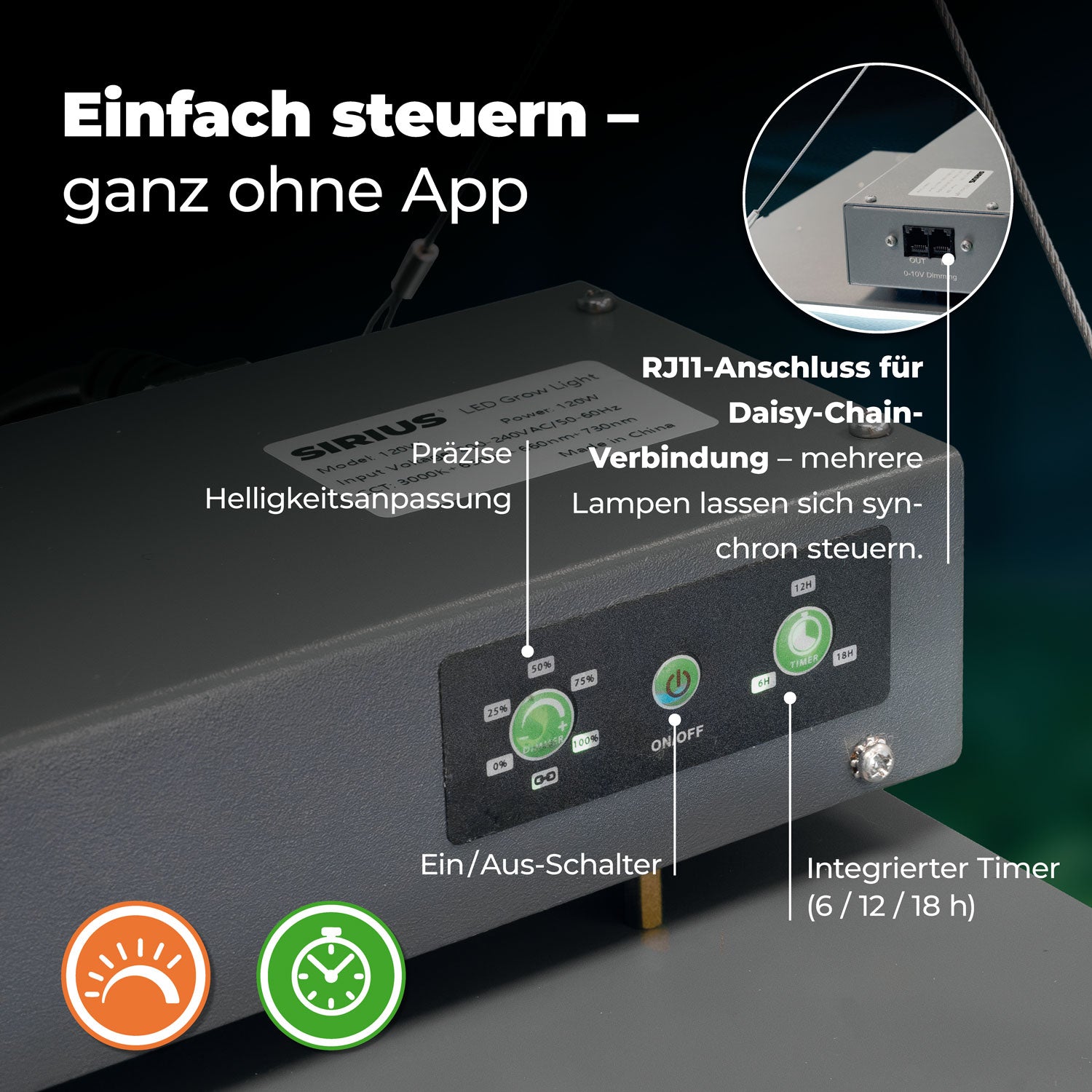 - Timerfunktion: 6, 12 oder 18 Stunden automatische Beleuchtungszyklen