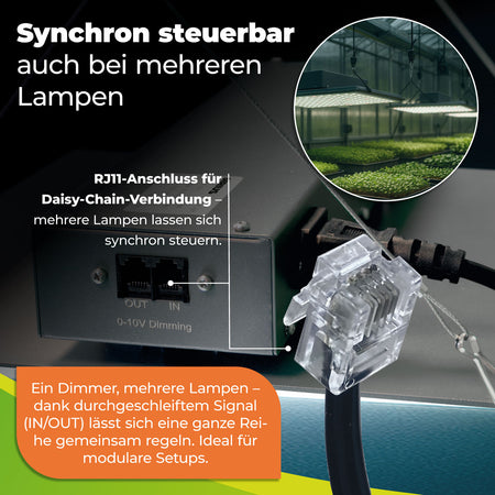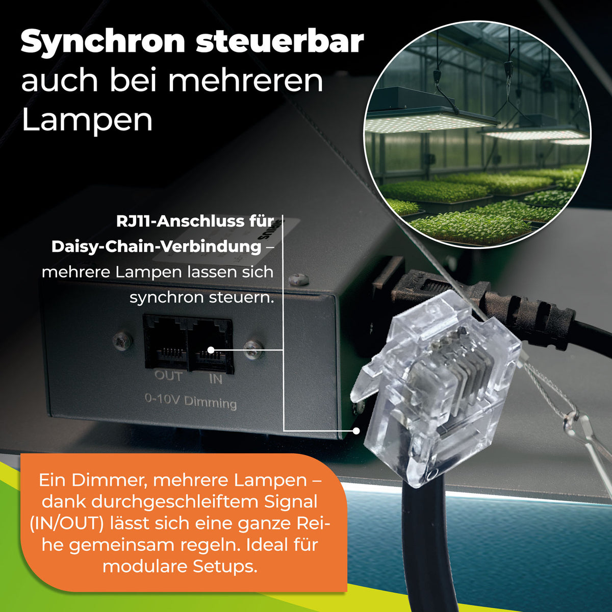 Über die integrierte 0–10 V Dimmfunktion (Steuergerät erforderlich) lässt sich die Helligkeit flexibel zwischen 0 und 100 % regulieren. Mehrere Lampen können dank IN/OUT-Funktion synchron gesteuert werden – ideal für modulare Setups. Die praktische Timerfunktion (6, 12 oder 18 Stunden) ermöglicht automatische Lichtzyklen und damit eine komfortable, zuverlässige Pflanzenbeleuchtung.