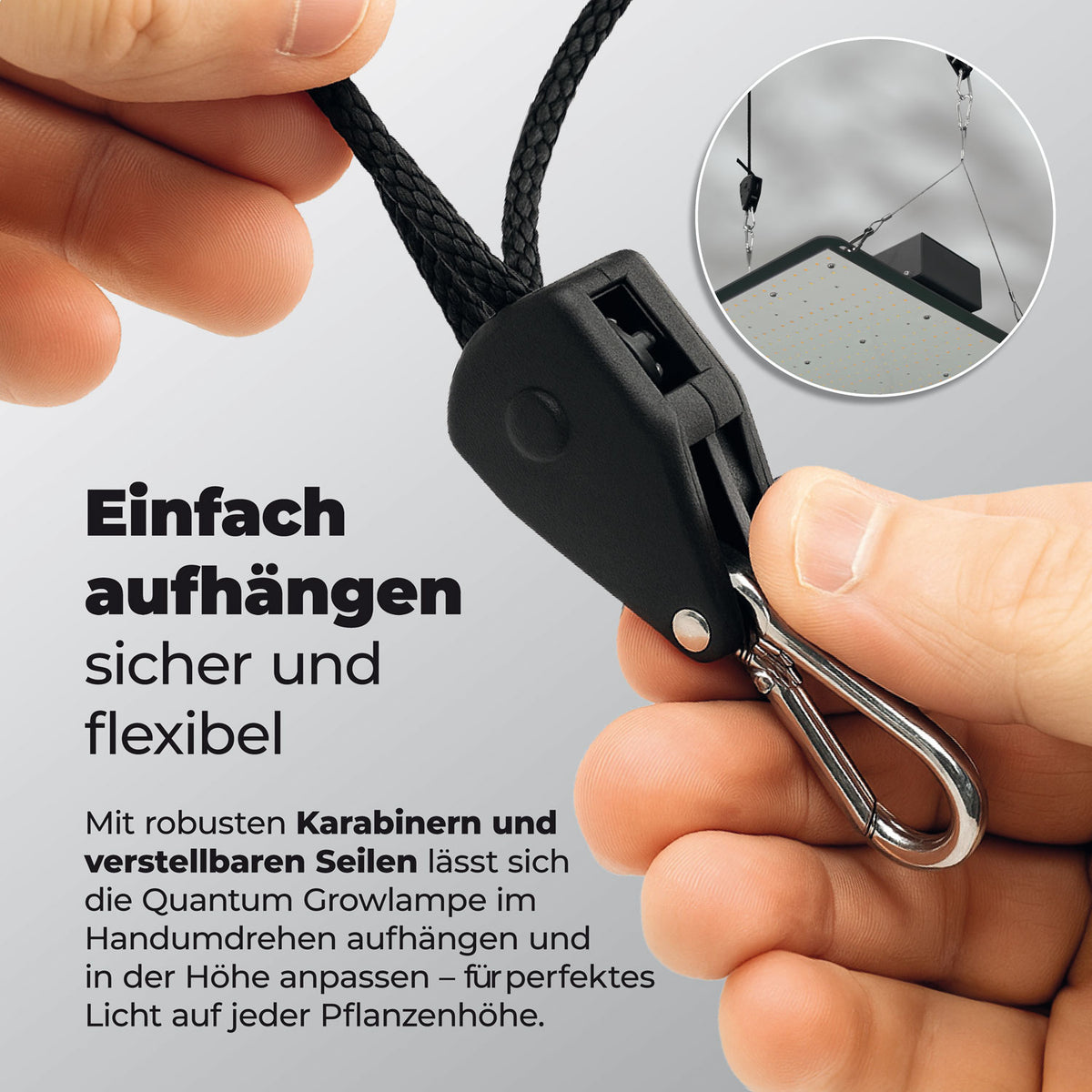 Die BioGreen SIRIUS ist sofort einsatzbereit – inklusive Aufhängevorrichtung mit Karabinern und Seilen für eine sichere und flexible Montage. Eine professionelle, langlebige Lösung für alle, die ihre Pflanzen optimal beleuchten möchten.