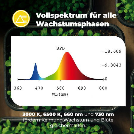 - Abgestimmte Lichtbereiche: 3000 K, 6500 K, 660 nm & 730 nm für natürliches Wachstum