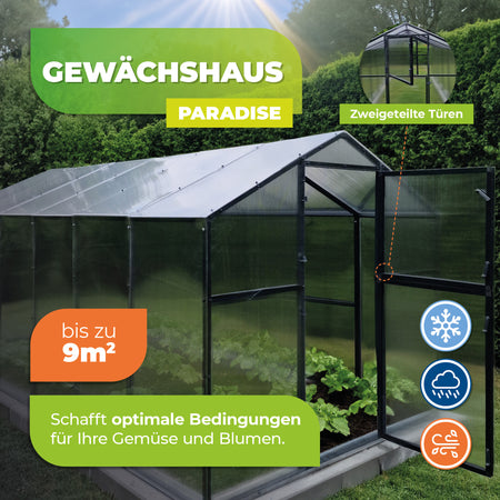 La serre "paradis" était en plastique robuste (PC) et en aluminium pour assurer une longue durée de vie. Ainsi, la serre résiste des vitesses de vent allant jusqu'à 60 km / h et peut transporter une charge de neige allant jusqu'à 30 kg / m² sur le toit. La serre est donc équipée pour presque toutes les conditions météorologiques.