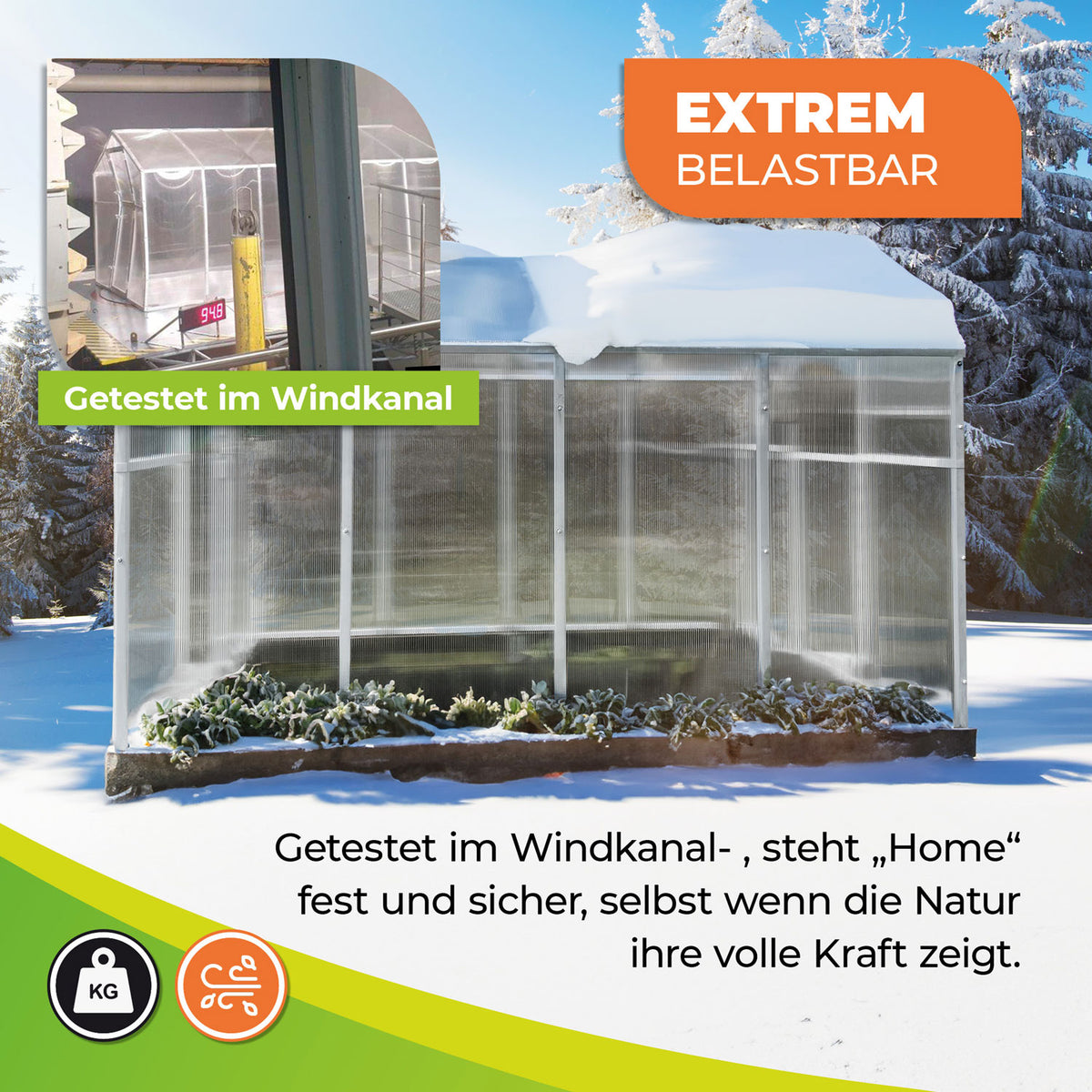 Zudem hält das Gewächshaus einer Windgeschwindigkeiten von bis zu 60 km/h stand. Außerdem hält das Gewächshaus Home eine Schneelast auf dem Dach von bis zu 30 kg/m² aus, was Ihnen zusätzliche Sicherheit gibt.