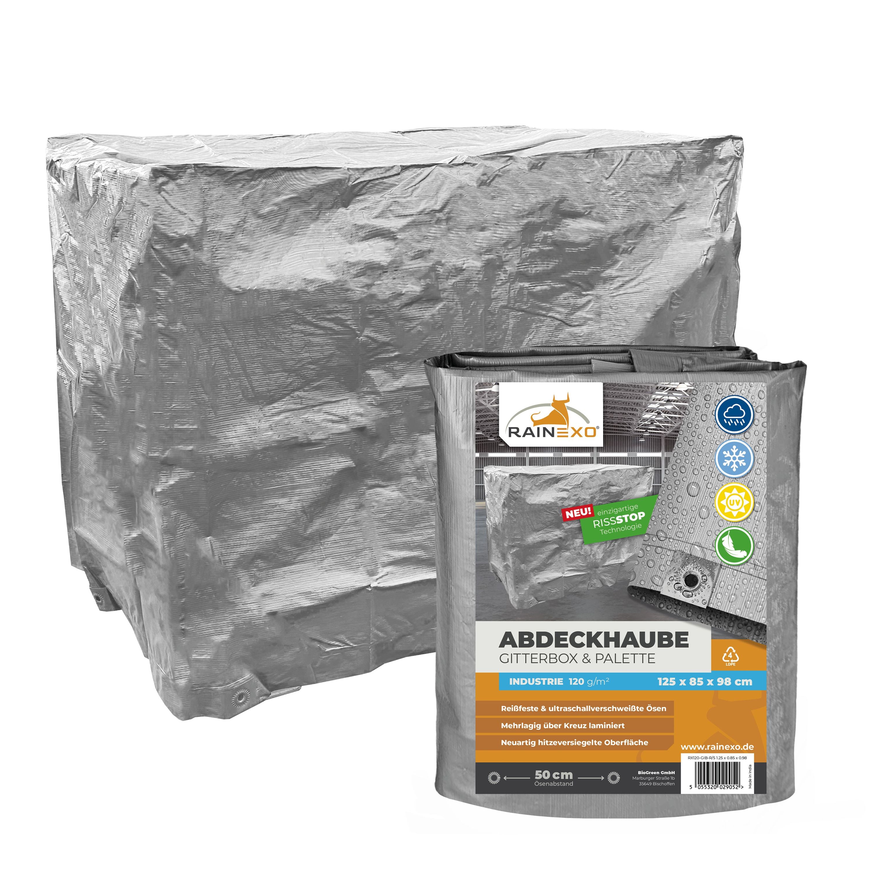 Schützen Sie Ihre wertvollen Lager- und Transportbehälter das ganze Jahr über mit der Rainexo Gitterbox-Abdeckhaube und verlängern Sie so deren Lebensdauer.