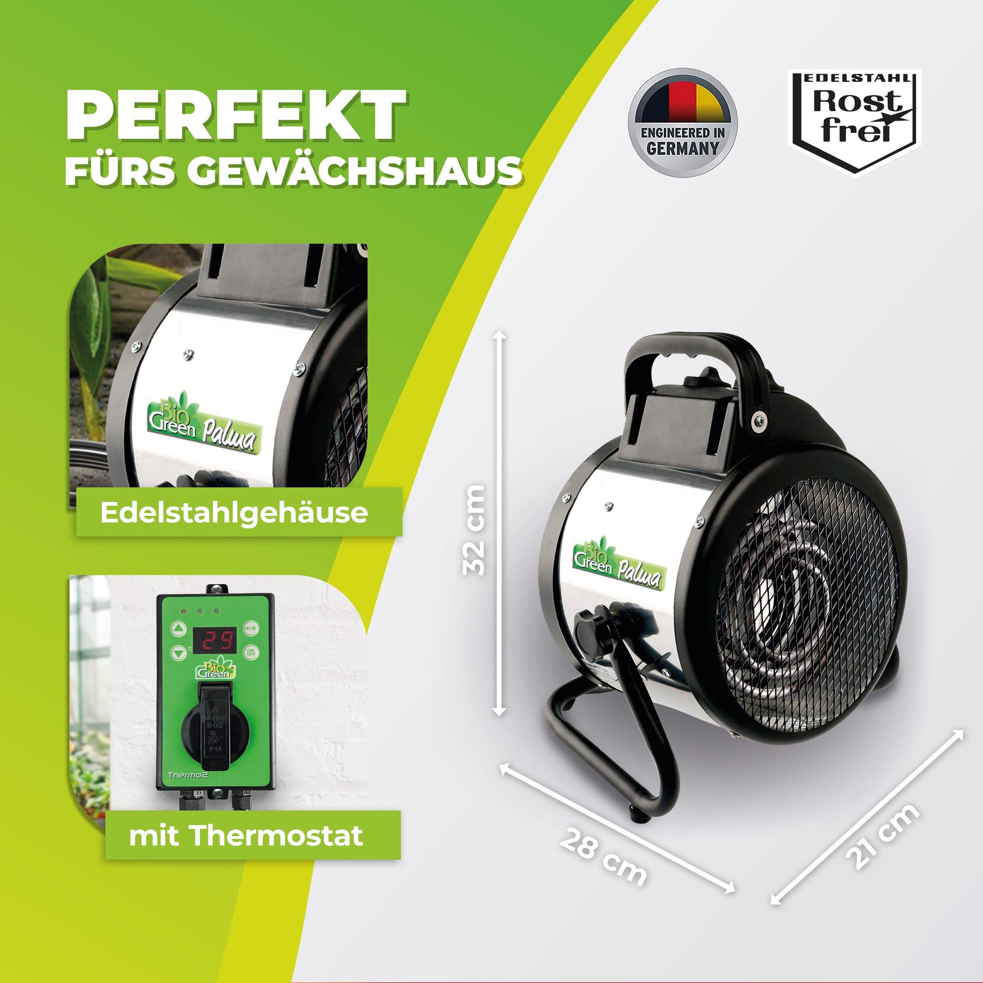 Elektro-Gebläse-Heizung „Palma“ mit digitalem Thermostat „Thermo 2“ für Gewächshäuser und Feuchträume