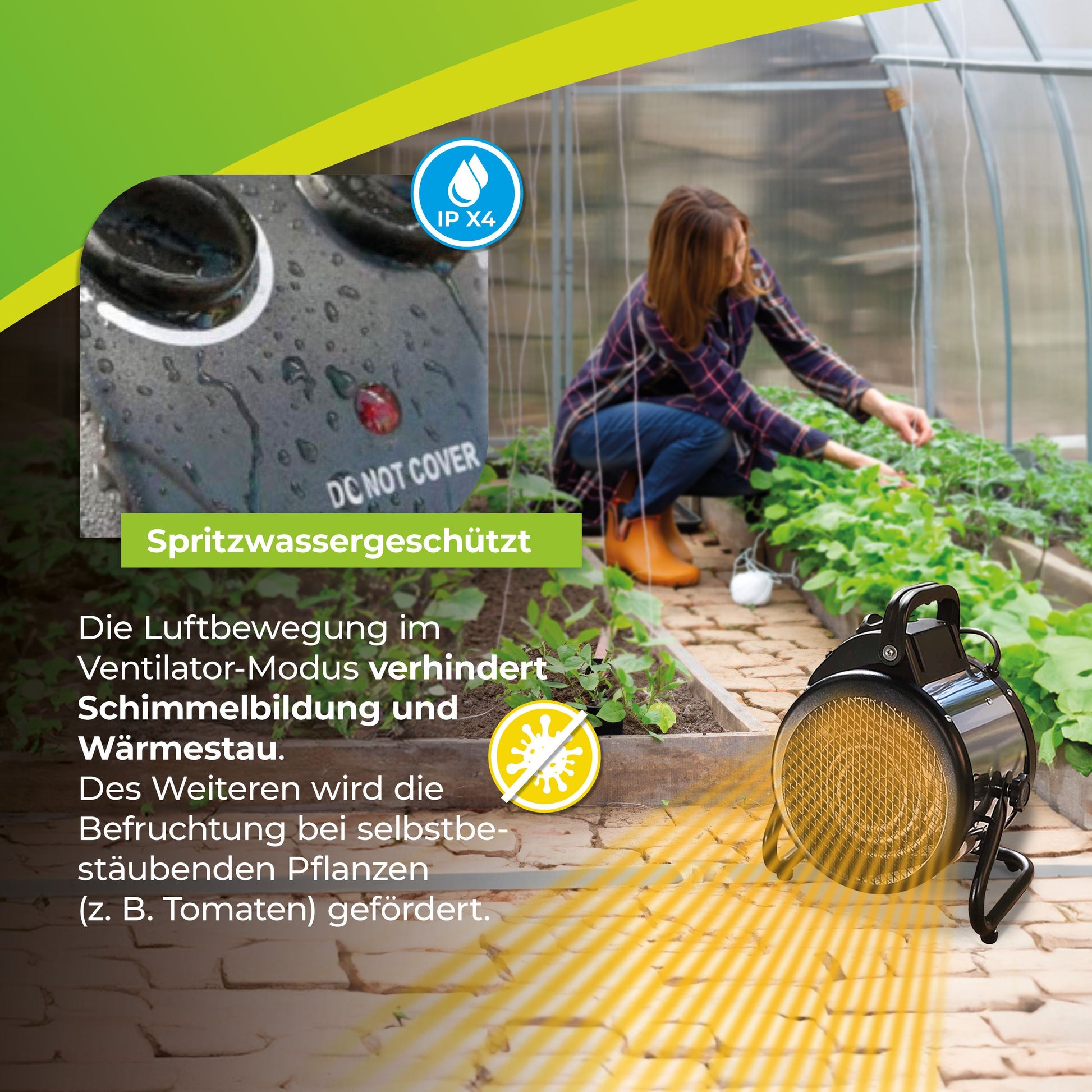 • Erfrischender Umluft-Modus: Aktivieren Sie den Umluft-Modus, wird die Heizung zum Gebläse. Ohne Heizleistung zirkuliert die Raumluft durch das Gerät, was für einen kühlenden Effekt wie bei einem Ventilator sorgt. An warmen Tagen ist das für Menschen und Pflanzen erfrischend. Die Luftbewegung verhindert die Schimmelbildung und Stauhitze an Pflanzen.