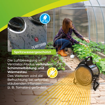 Passt nahezu überall hin: Dank kompakter Maße platzieren Sie die Umluftheizung auch in kleineren Gewächshäusern. Dank einer Kabellänge von 1,90 Metern sind bei der Wahl des Aufstellungsortes sehr flexibel. Dank den rutschfesten Gummifüßen steht die Gewächshausheizung sicher auf dem Boden. Und wenn Sie die Heizung transportieren, haben Sie sie mit dem integrierten, einklappbaren Tragegriff sicher in der Hand. Die Heizung ist nach IPX4 spritzwassergeschützt. So ist sie auch in Feuchträumen sicher und zuverlässig verwendbar. Dank einer robusten Konstruktion hält die Gebläseheizung auch Stöße aus.