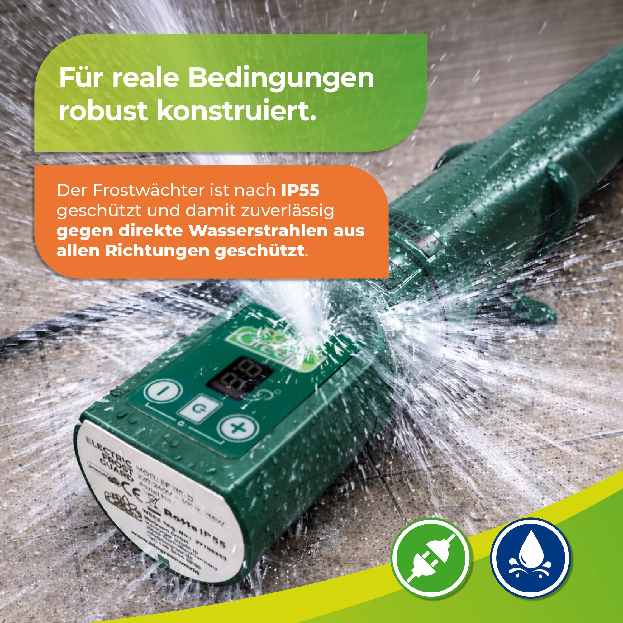 Schutz gegen Strahlwasser aus allen Richtungen nach IP55: Die Heizung ist auch in Feuchträumen wie Kellern sicher einsetzbar und widersteht Strahlwasser problemlos.