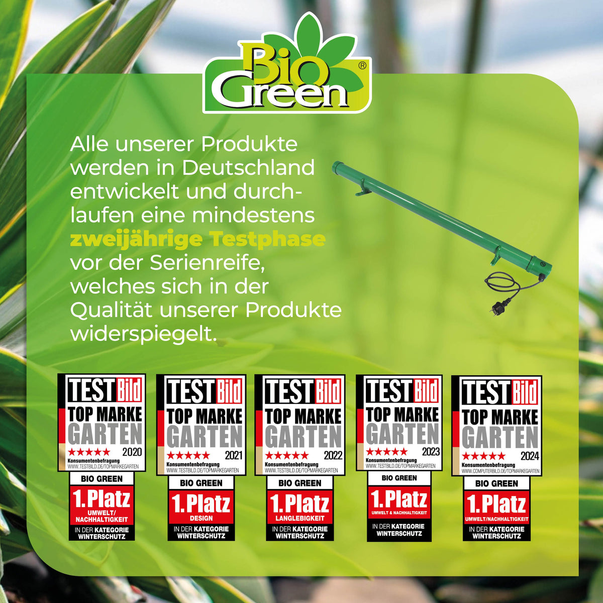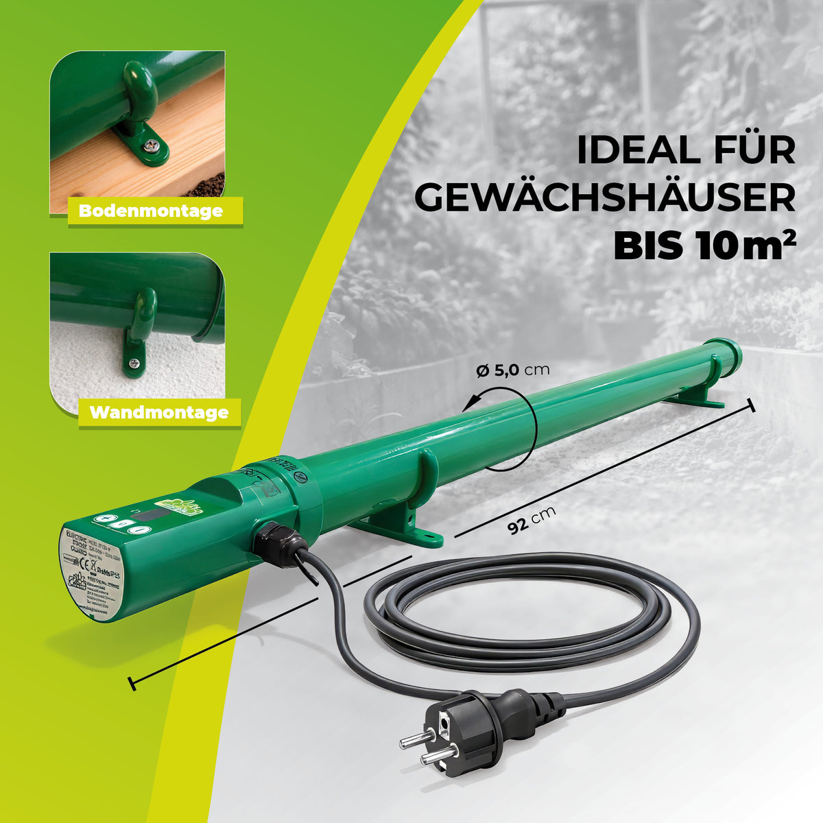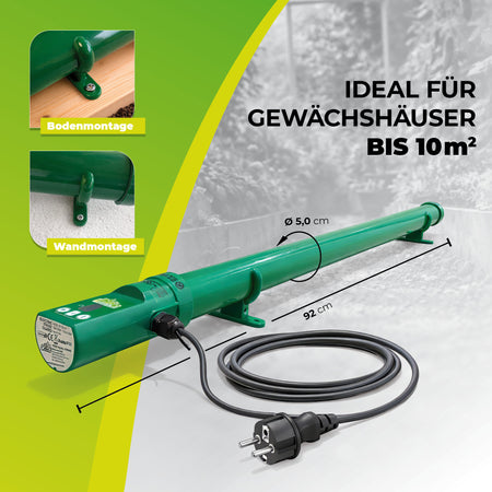 Die Bedienung ist kinderleicht: Temperatur einstellen, einstecken – und der Frostwächter übernimmt den Rest. Durch den Spritzwasserschutz nach IPX4 ist das Gerät zudem sicher in feuchten Umgebungen einsetzbar, beispielsweise in Gewächshäusern, Folientunneln, Frühbeeten oder Kellerräumen. Mit einer Länge von nur 92 cm und einem Durchmesser von 5 cm ist die Heizung äußerst platzsparend und kann wahlweise aufgestellt oder mithilfe der Halterungen an der Wand montiert werden. So erhalten Ihre Pflanzen eine zuverlässige, konstante Wärmequelle, die sie sicher durch die kalte Jahreszeit bringt.