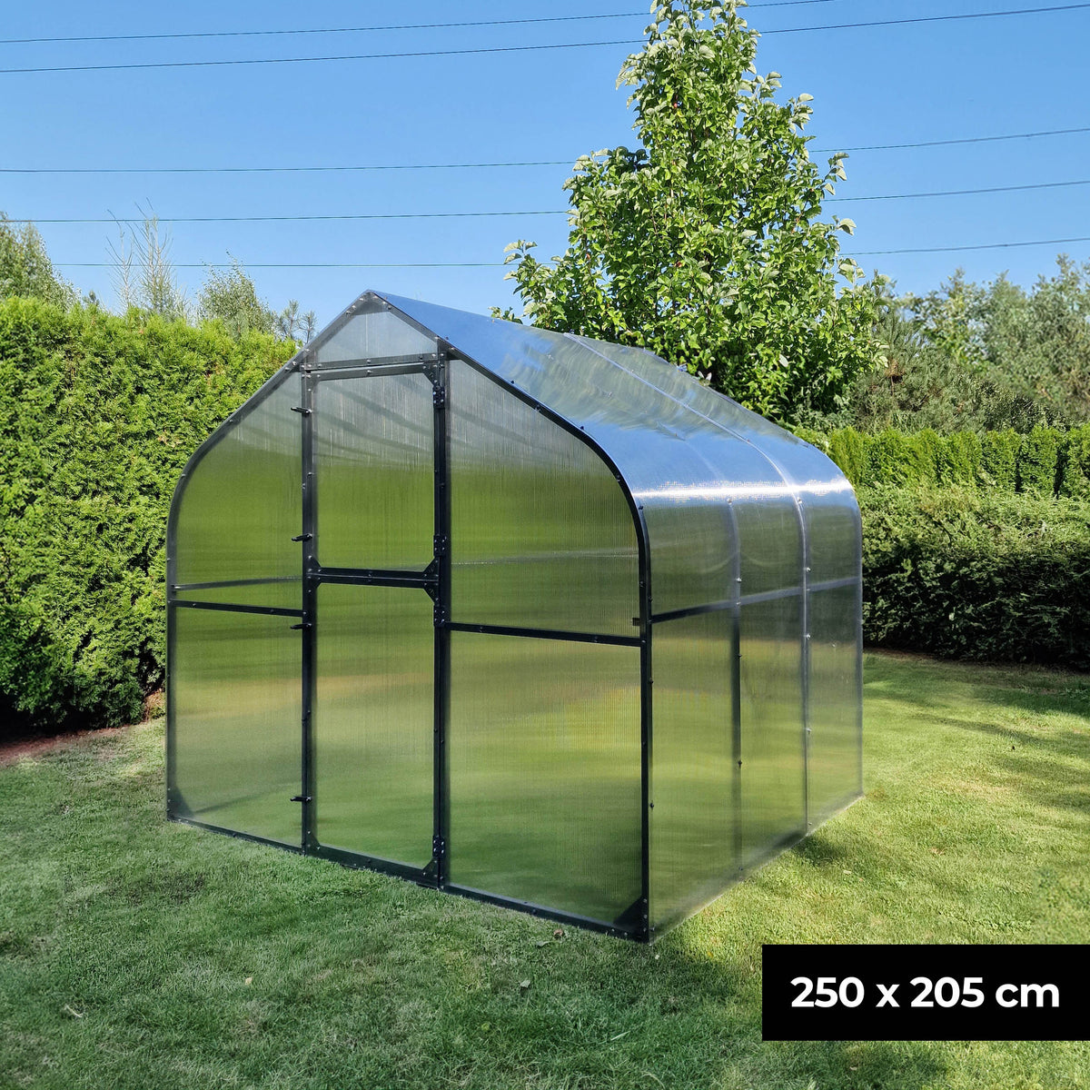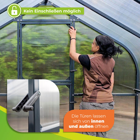Das Gewächshaus verfügt über zwei Türen, die in zwei Bereiche unterteilt sind, um eine gute Belüftung zu ermöglichen. So kommt frische Luft ins Gewächshaus und Sie verhindern, dass ungebetene Gäste das Gewächshaus betreten.