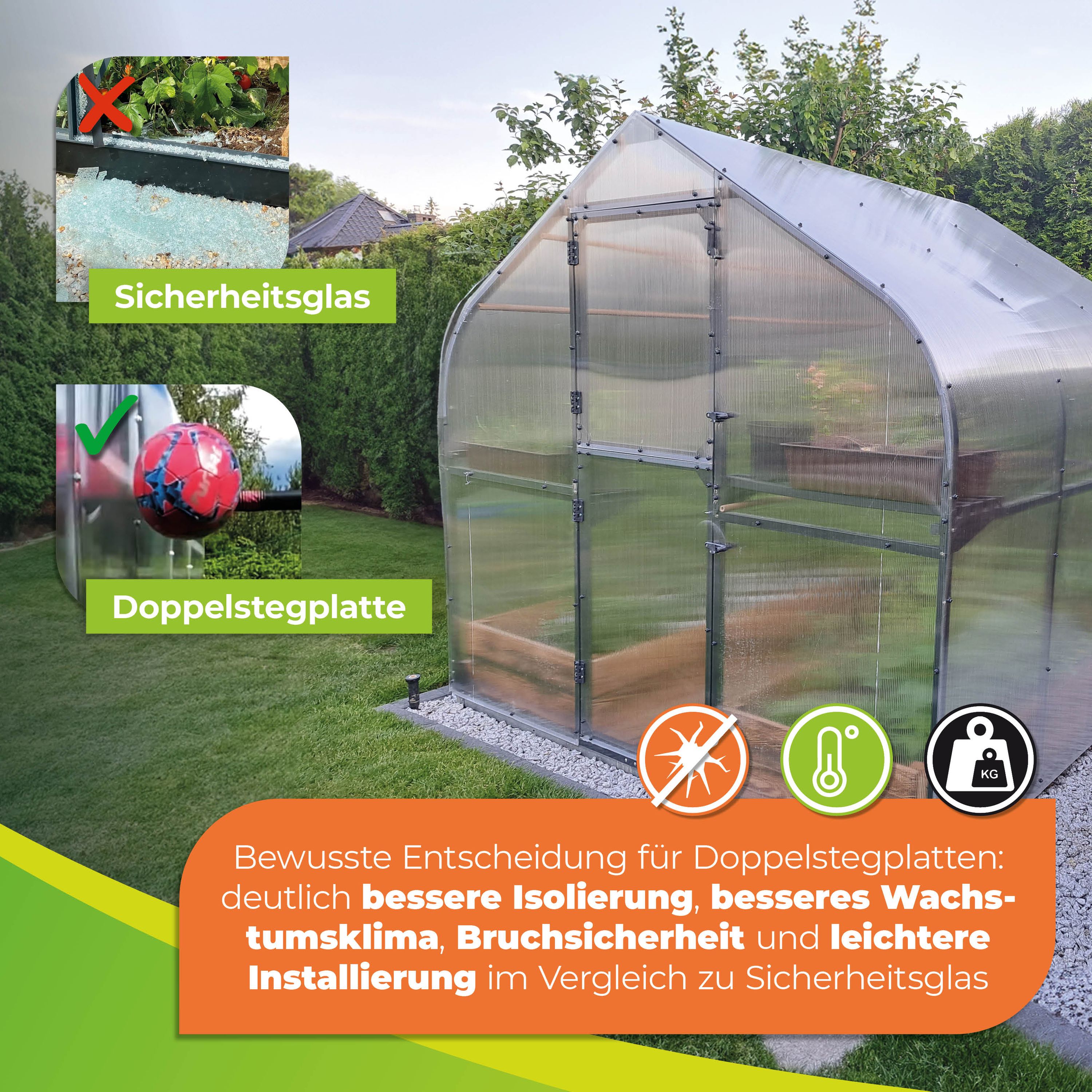 Die leichten Kunststoffscheiben sorgen für eine gute Lichtdurchlässigkeit und ermöglichen es Ihren Pflanzen, ausreichend Sonnenlicht zu erhalten. Außerdem sind die Kunststoffscheiben UV-beständig. So haben Sie lange Freude an Ihrem Gewächshaus.