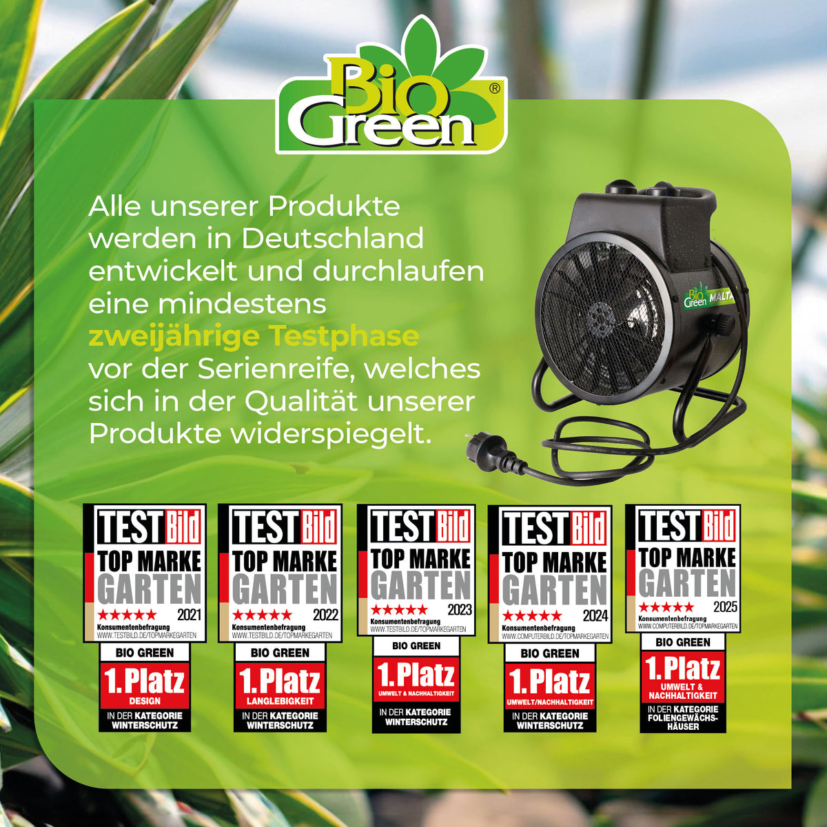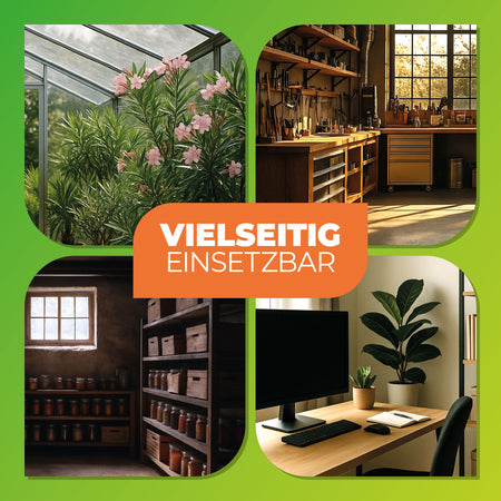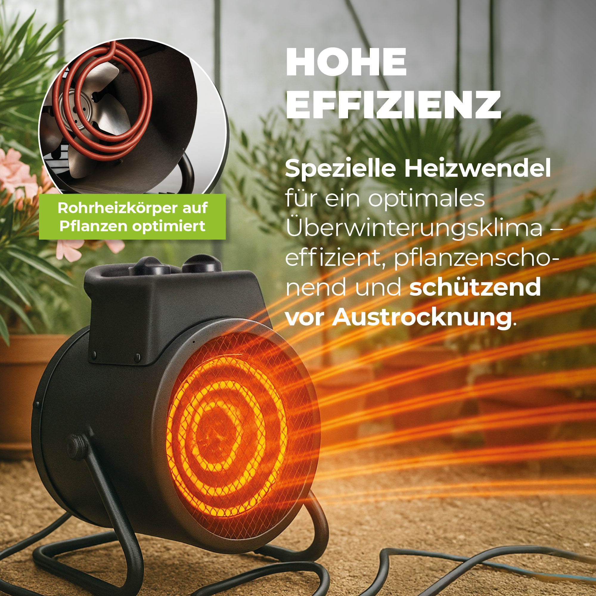 Die Heizung ist mit hochwertigen, rostfreien Edelstahl-Heizelementen ausgestattet. Das widerstandsfähige Metallgehäuse ist für den Einsatz unter anspruchsvollen Bedingungen konzipiert – witterungsbeständig, stabil und sicher. Der integrierte Überhitzungsschutz und Kippschutz sorgen zusätzlich für maximale Sicherheit im Gewächshaus.