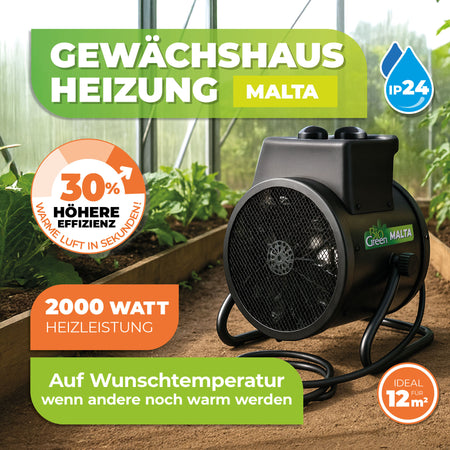 Die elektrische Gewächshausheizung Malta 2.0 ist die ideale Lösung, wenn Sie Ihre Pflanzen auch in der kalten Jahreszeit zuverlässig vor Frost, Feuchtigkeit und Temperaturschwankungen schützen möchten. Mit durchdachter Technik, starker Heizleistung und robuster Konstruktion bietet diese Heizung alles, was Sie für ein stabiles Gewächshausklima brauchen – selbst bei Außentemperaturen von bis zu -15 °C.
