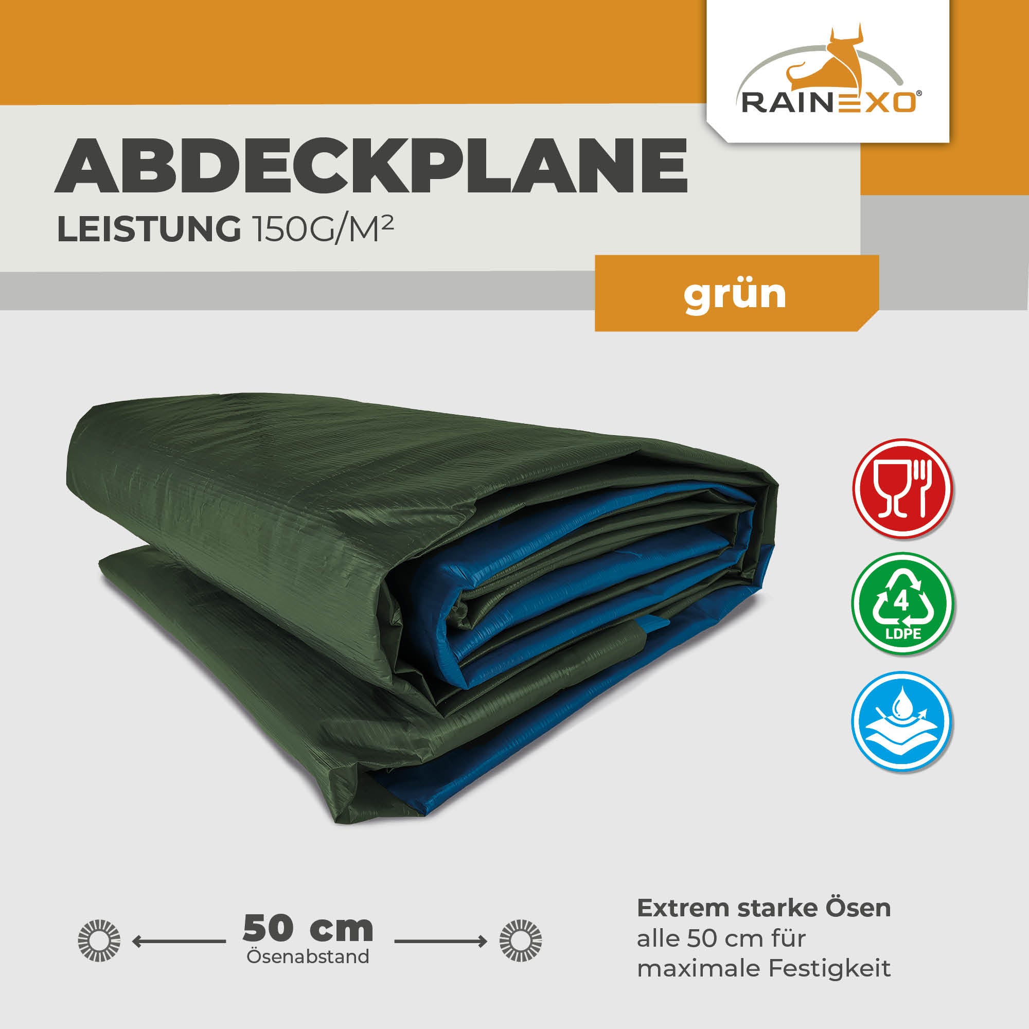 Schützen Sie Ihre wertvollen Outdoor-Gegenstände mit der Rainexo Abdeckplane "POWER" in einem Grün-Blau-Ton. Diese hochwertigen Planen bieten eine erstklassige Verarbeitung, halten rund 5x länger als herkömmliche Planen und zeichnen sich durch extreme Reißfestigkeit und eine herausragende UV-Beständigkeit aus. Sie sind zu 100 % wasserdicht und frostbeständig und vielseitig einsetzbar. Die Planen sind leicht und einfach zu handhaben, während ihre doppelten geschweißten Ränder und die alle 50 cm platzierten reißfesten Ösen für eine sichere Befestigung sorgen. Darüber hinaus sind sie vollständig recyclebar und umweltfreundlich. Erleben Sie den zuverlässigen Schutz Ihrer Outdoor-Ausrüstung mit diesen qualitativ hochwertigen Abdeckplanen.