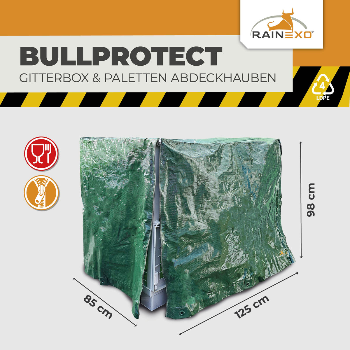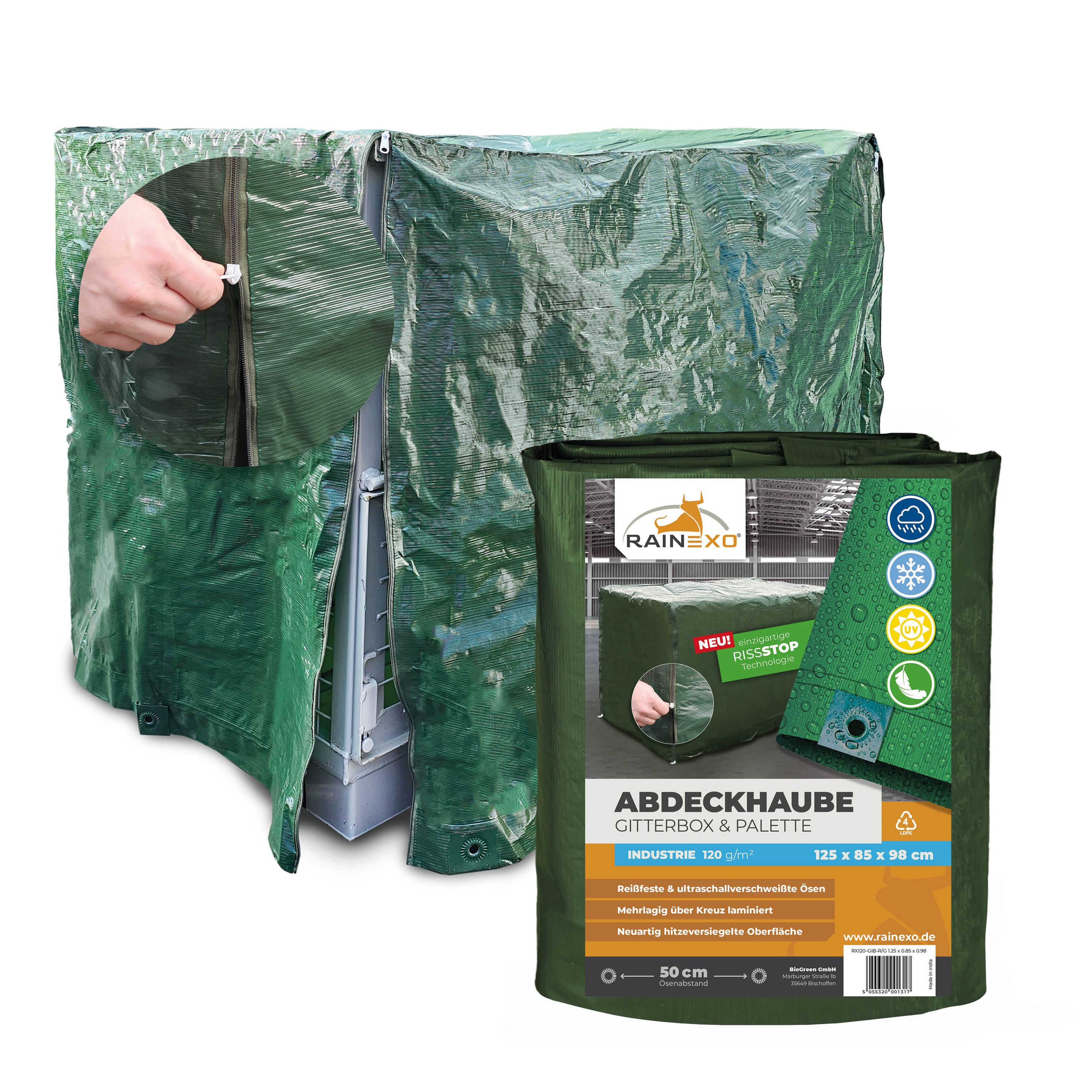 Schützen Sie Ihre Gitterboxen effektiv vor Witterungseinflüssen mit der Rainexo Gitterbox-Abdeckhaube mit Reißverschluss. Diese hochwertige Abdeckung ist speziell für den Einsatz im Freien konzipiert und bietet zuverlässigen Schutz für Ihre Gitterboxen. Die Abdeckhaube besteht aus 100% recyclebarem Polyethylen und ist mit einer wasserdichten Laminierung ausgestattet, die Ihre Gitterboxen vor Feuchtigkeit schützt. Dank des während der Fertigung dem PE-Granulat beigemischten UV-Protectors ist die Abdeckhaube zu 100% UV-beständig und bietet somit auch einen zuverlässigen Schutz vor schädlicher Sonneneinstrahlung.Mit einer Materialstärke von 120 g/m² und hitzeversiegelten Nähten ist diese Abdeckhaube besonders strapazierfähig und langlebig. Die Abmessungen von 125 x 85 x 98 cm passen perfekt zu den meisten Standard-Gitterboxen und bieten einen optimalen Schutz.