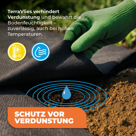 Das Mulchvlies besteht aus speziellen Textilfasern, die eine hohe Atmungsaktivität gewährleisten. Wasser, Luft und Nährstoffe gelangen ungehindert in den Boden, sodass Ihre Pflanzen weiterhin optimal versorgt werden. Gleichzeitig verhindert das Vlies das Wachstum von Unkraut und konserviert die Bodenfeuchtigkeit sowie Erdwärme. So sind Ihre Pflanzen auch bei Trockenheit im Sommer und Frost im Winter bestens geschützt.
