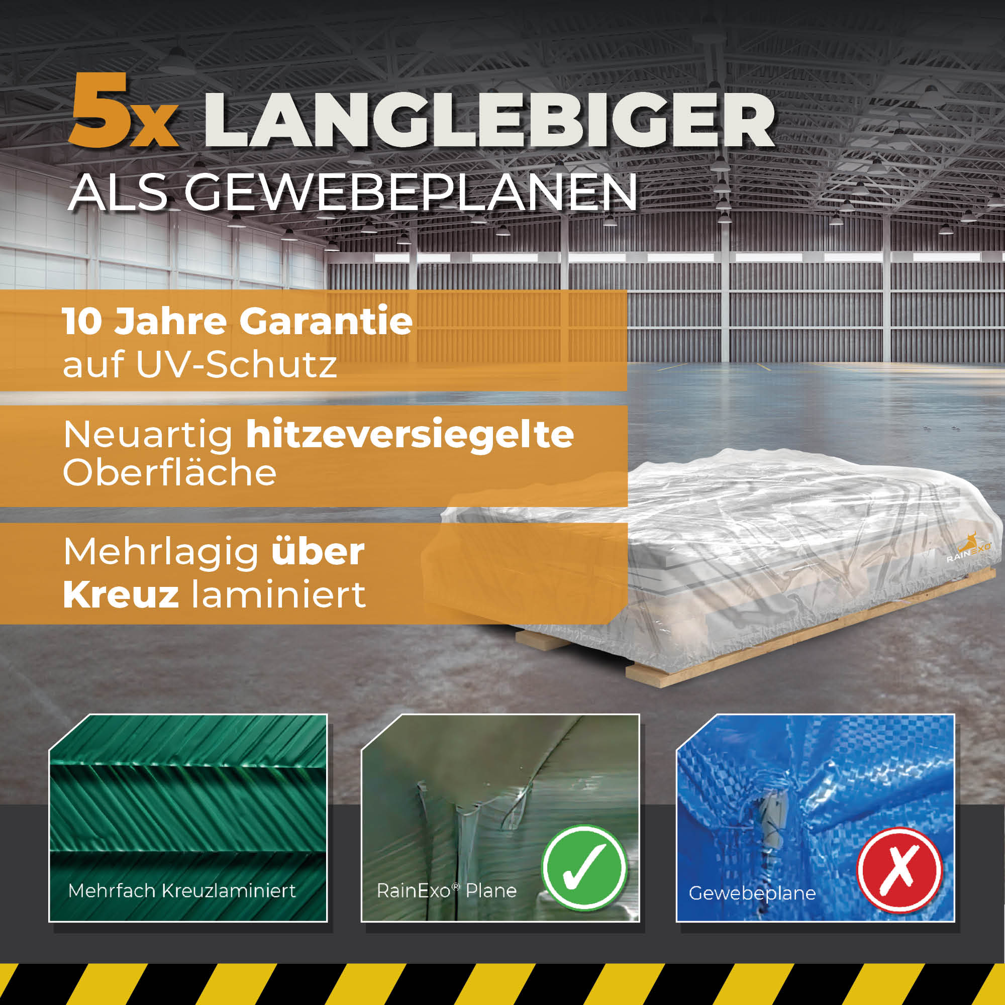 • Wetterfester Schutz: RAINEXO Abdeckplanen schützen Palettenrahmen zuverlässig vor Regen, Schnee, Staub und UV-Strahlen.